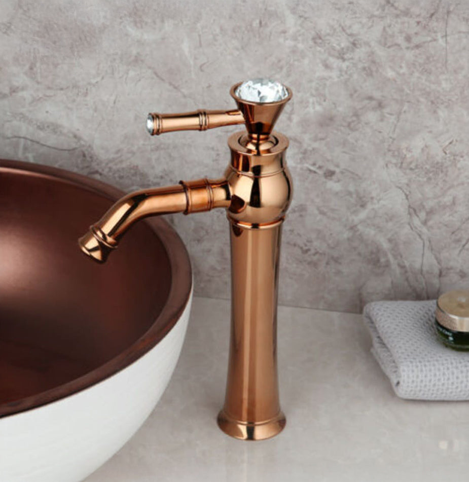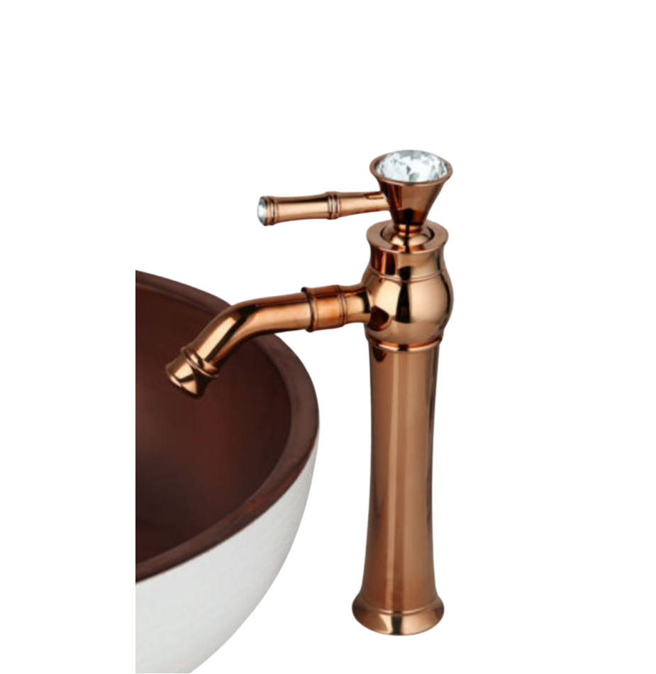 The TVN-08-RG features a rose gold finish with a crystal top that brings elegance and functionality to any bathroom space. Its opulent look and smooth control complement both modern and classic interiors. Crafted from premium-quality brass with a polished coating, it ensures durability, resistance to stains and scratches, and effortless maintenance. Designed for countertop installation, this faucet offers a refined look with lasting performance — ideal for both residential and commercial environments.