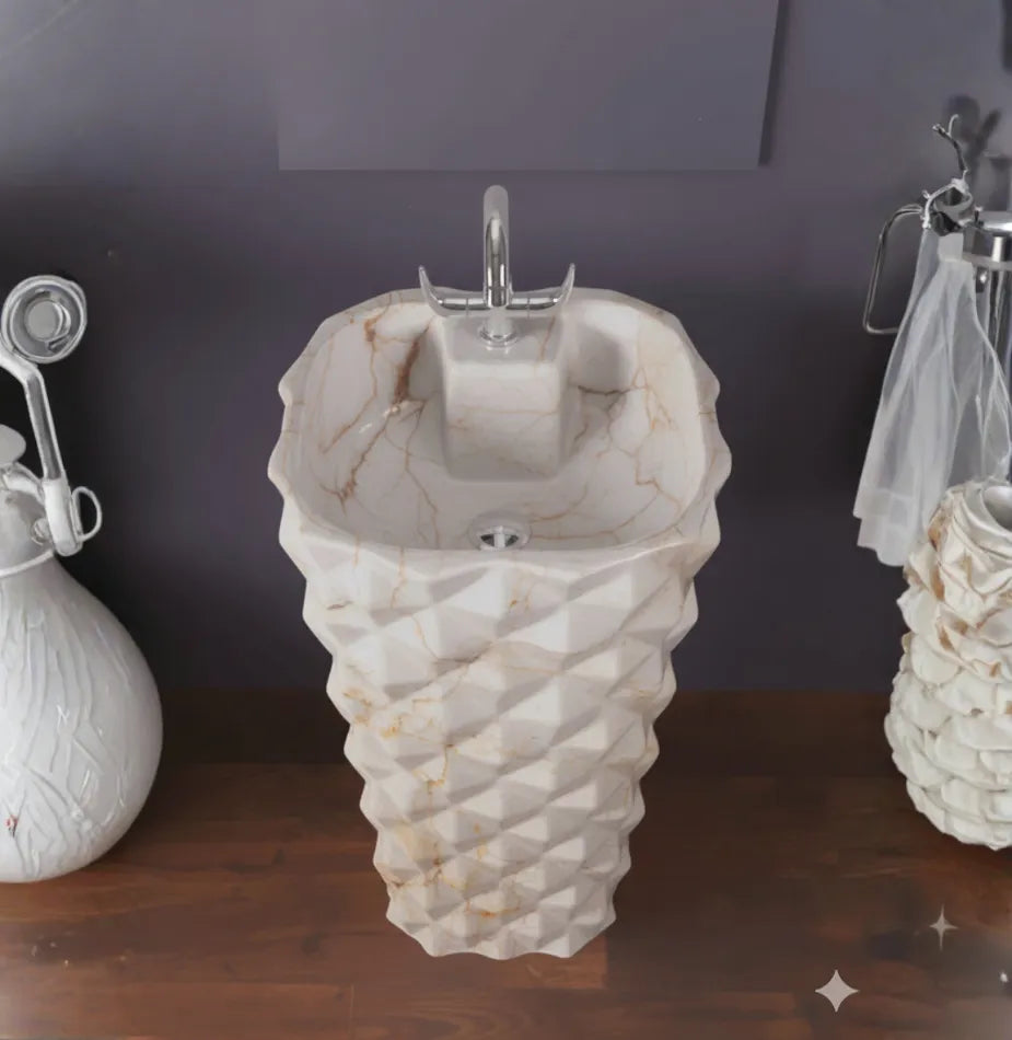The Lomino Prism Gold features a sculptural pedestal with diamond-cut texture and golden veining. Its glossy finish adds drama and dimension to modern interiors. Crafted from premium-quality ceramic with a crystalline glaze, it ensures durability, resistance to stains and scratches, and effortless maintenance. Designed for wall-mounted faucet setup, this basin offers a refined look with lasting performance — ideal for both residential and commercial environments.