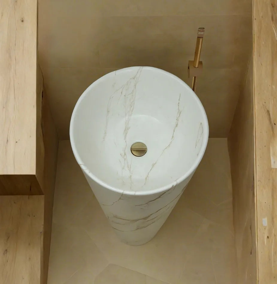 The Ivory Trace features a sleek conical pedestal with soft ivory tones and delicate brown veining. Its soft matt texture and minimalist form suit serene and modern bathrooms. Crafted from premium-quality ceramic with a crystalline glaze, it ensures durability, resistance to stains and scratches, and effortless maintenance. Designed for wall-mounted faucet setup, this basin offers a refined look with lasting performance — ideal for both residential and commercial environments.