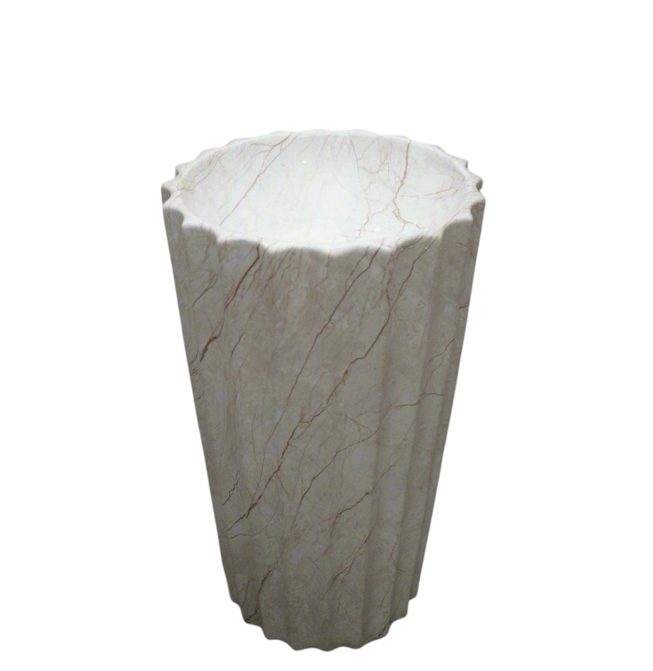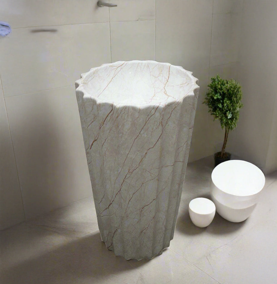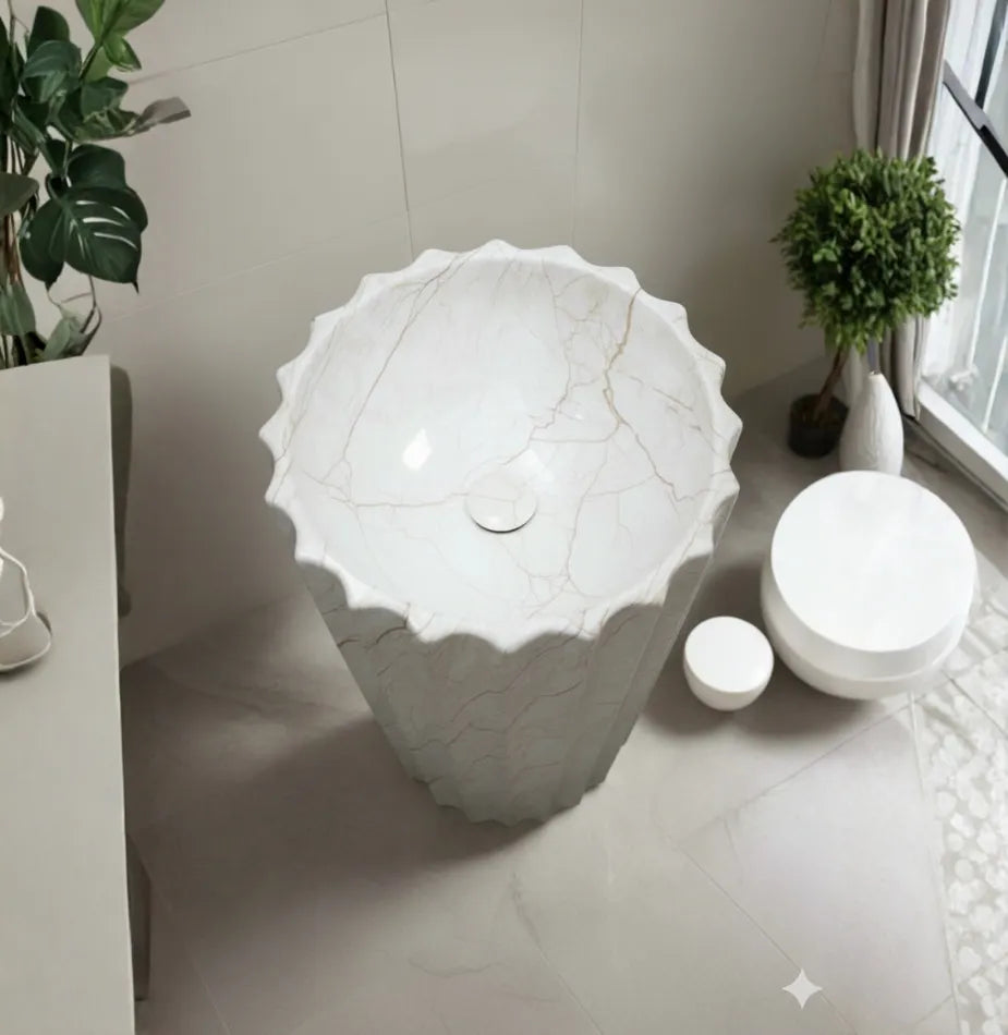 The Proton Crest Beige features a sculptural fluted pedestal with scalloped edges and warm beige veining. Its soft matt texture adds texture and elegance to any space. Crafted from premium-quality ceramic with a crystalline glaze, it ensures durability, resistance to stains and scratches, and effortless maintenance. Designed for pedestal setup, this basin offers a refined look with lasting performance — ideal for both residential and commercial environments.