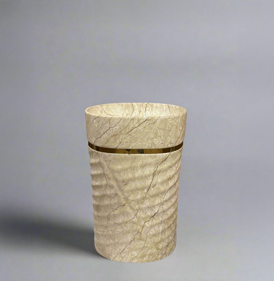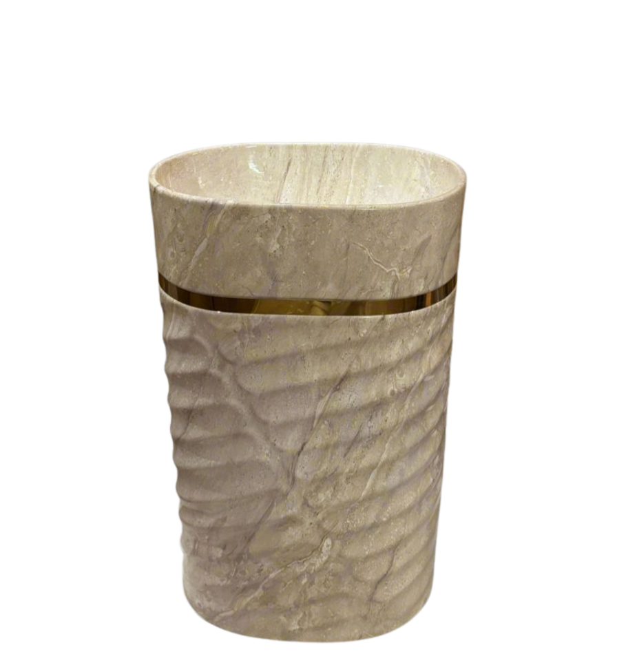 The Ridge Cream features a creamy beige vessel with soft veining and a gold accent. Its ribbed texture and warm tones create a serene, spa-like ambiance. Crafted from premium-quality ceramic with a crystalline glaze, it ensures durability, resistance to stains and scratches, and effortless maintenance. Designed for pedestal setup, this basin offers a refined look with lasting performance — ideal for both residential and commercial environments.