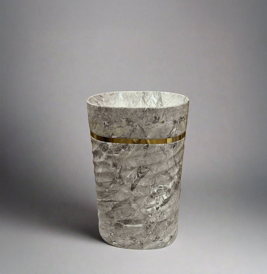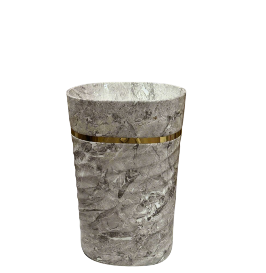 The Ridge Slate features a rugged gray vessel with layered stone texture and a gold band. Its bold surface adds depth and character to contemporary interiors. Crafted from premium-quality ceramic with a crystalline glaze, it ensures durability, resistance to stains and scratches, and effortless maintenance. Designed for pedestal setup, this basin offers a refined look with lasting performance — ideal for both residential and commercial environments.