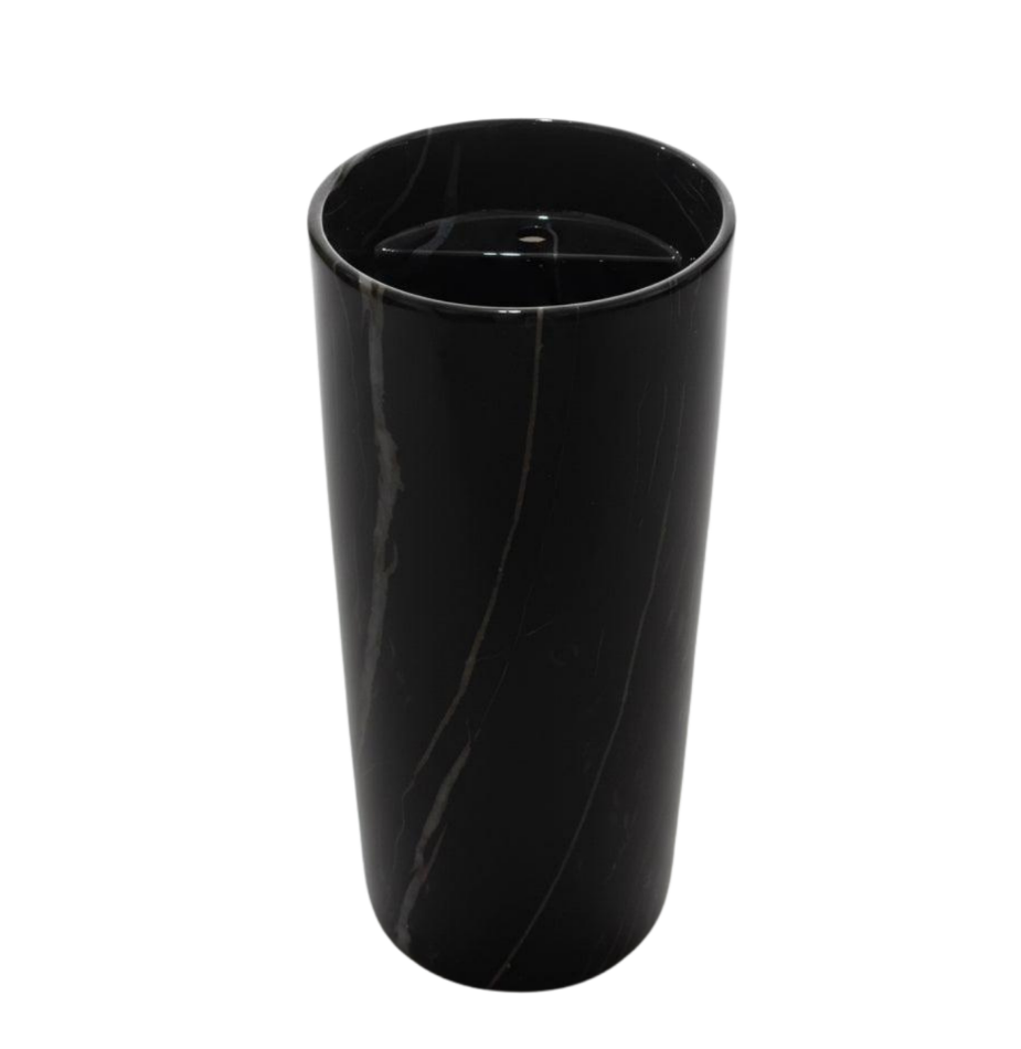 The Motto Obsidian features a tall, glossy black pedestal with white veining and a tap hole that adds drama and depth to minimalist interiors. Its glossy finish complements chrome fixtures and modern luxury spaces. Crafted from premium-quality ceramic with a crystalline glaze, it ensures durability, resistance to stains and scratches, and effortless maintenance. Designed for pedestal setup, this basin offers a refined look with lasting performance — ideal for both residential and commercial environments.
