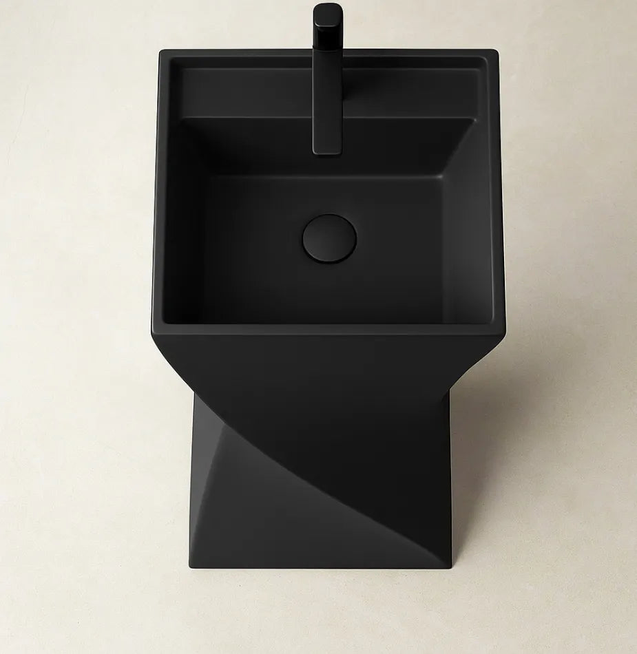 The Twist Noir features a bold pedestal with a twisted silhouette and matte black finish. Its sculptural form adds drama and elegance to modern interiors. Crafted from premium-quality ceramic with a durable glaze coating, it ensures durability, resistance to stains and scratches, and effortless maintenance. Designed for pedestal setup, this basin offers a refined look with lasting performance — ideal for both residential and commercial environments.