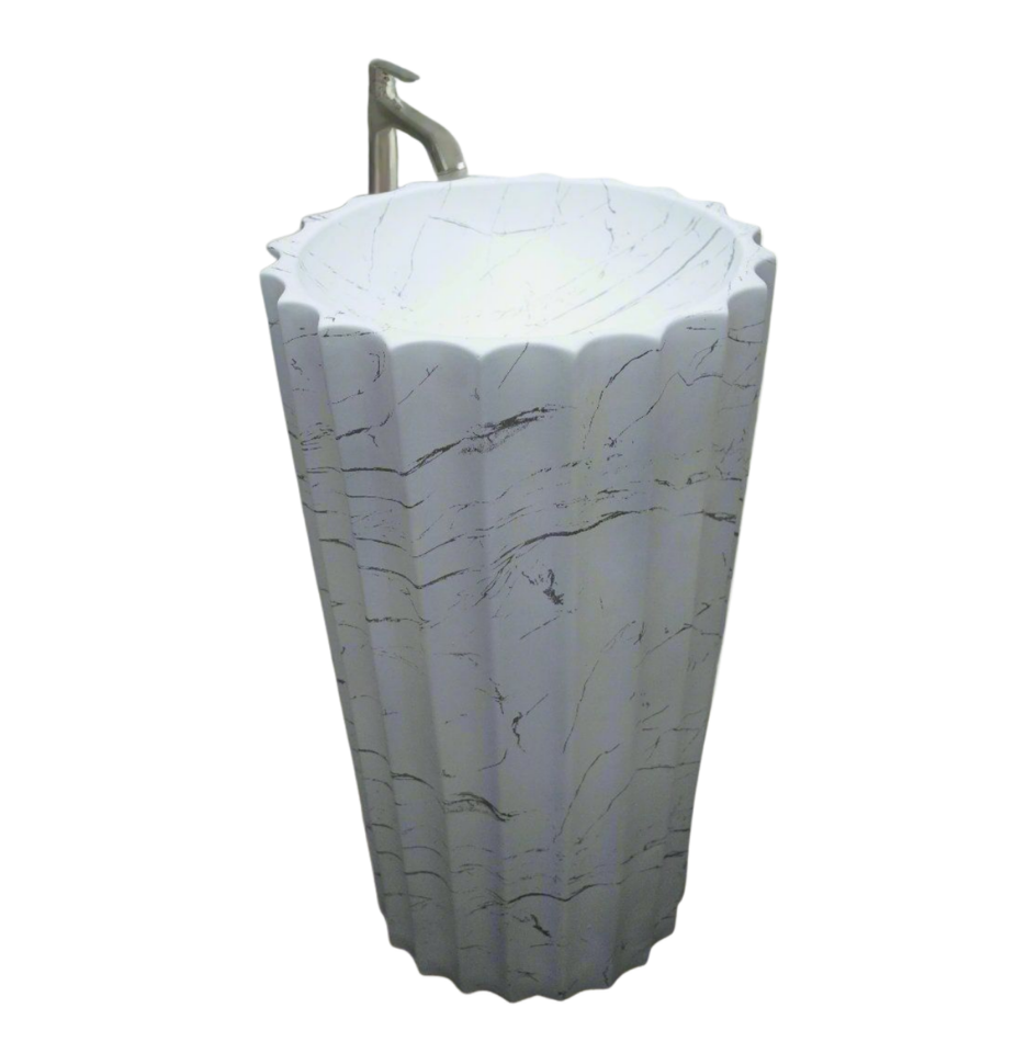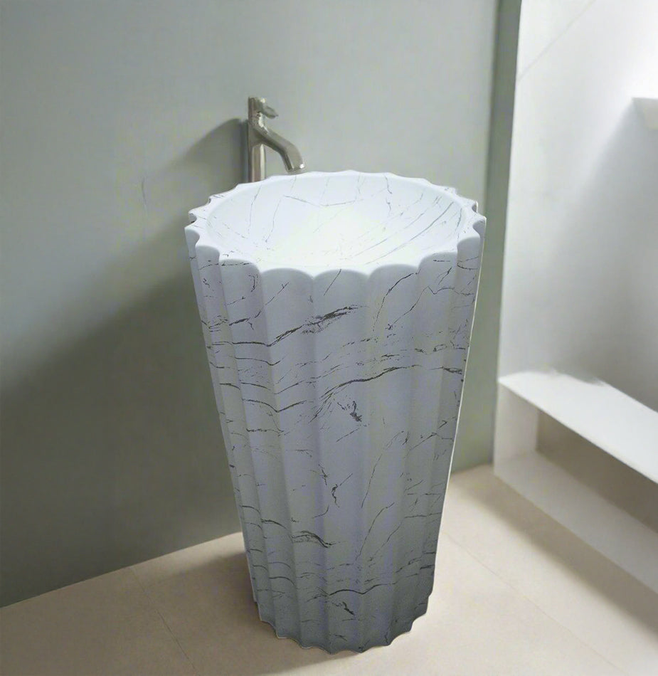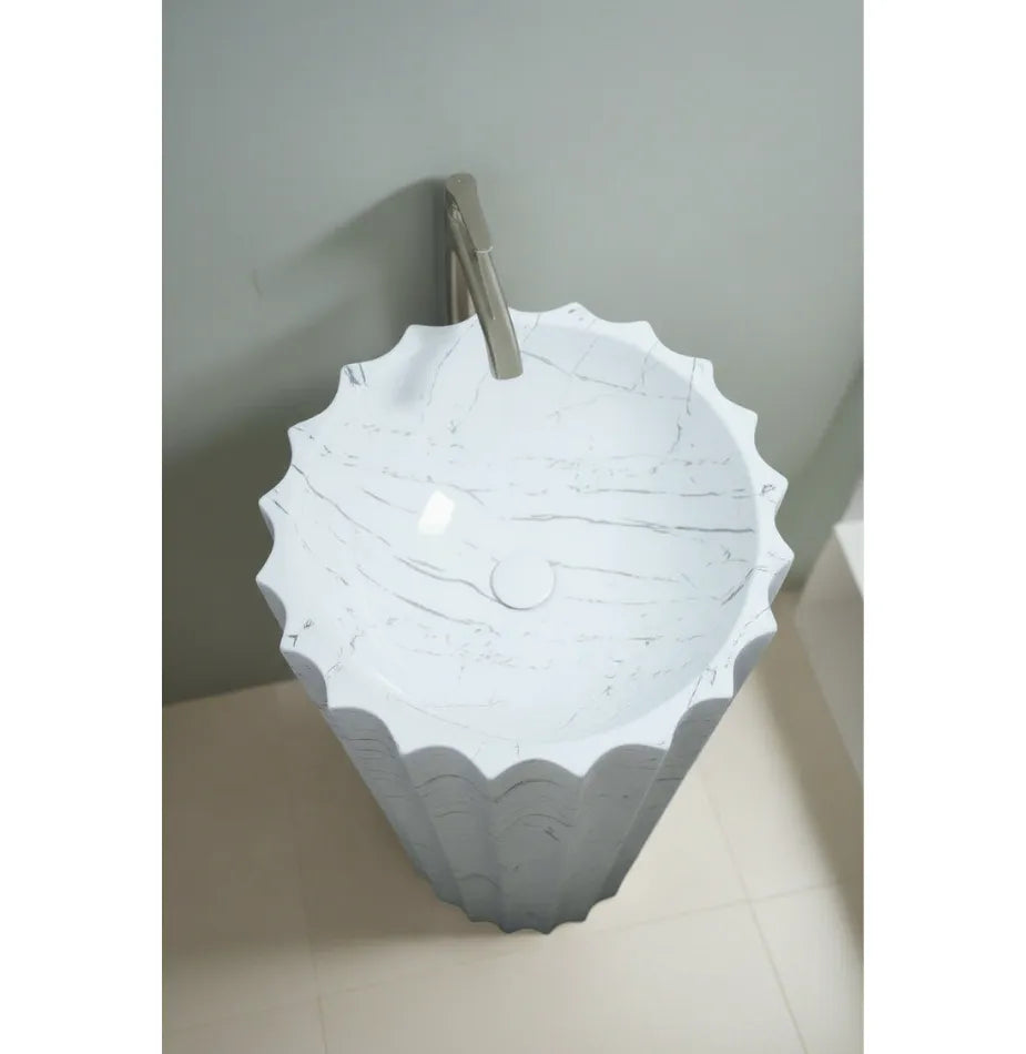 The Proton Crest pedestal basin is a sculptural fusion of art and function, featuring a fluted body with scalloped edges and intricate marble veining. Its architectural silhouette brings texture and movement to bathroom interiors, making it an eye-catching centerpiece for luxury spaces. Perfect for those who appreciate artistic form with everyday practicality.