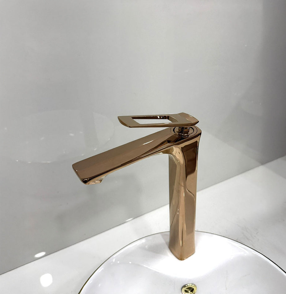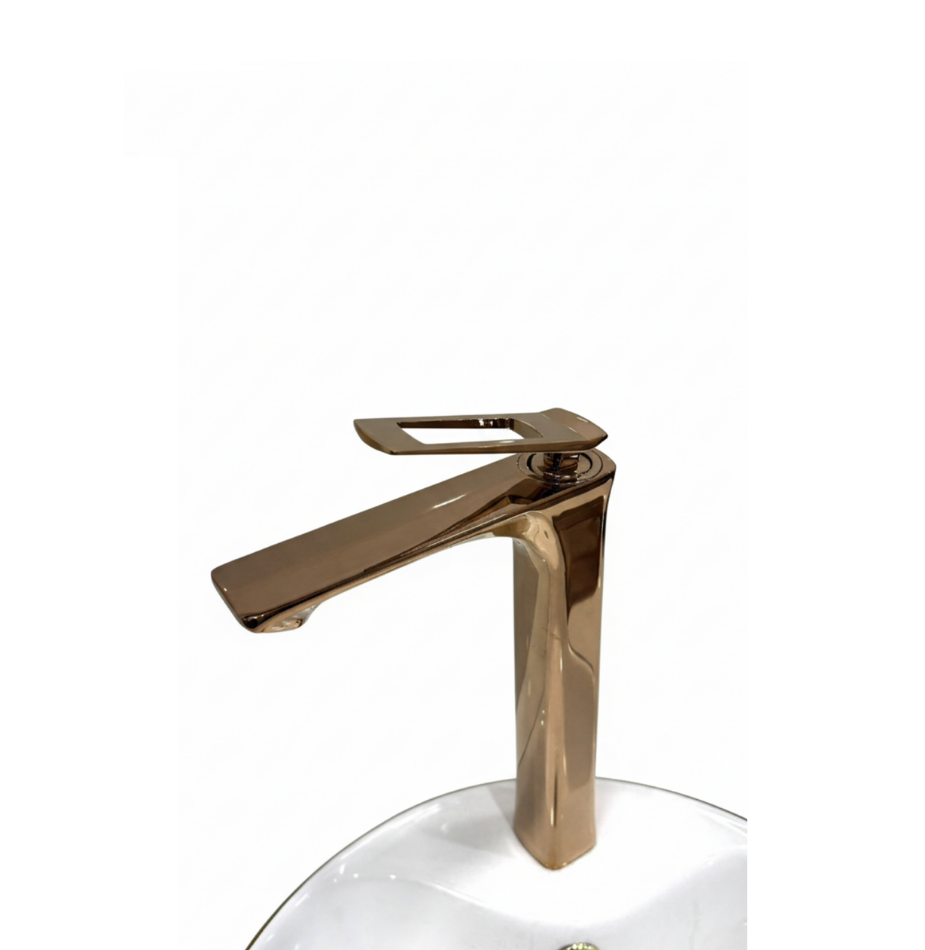 The Aurum Crest (041-RG) stands tall like a sculpture, blending gold and chrome tones into one luxurious form. Its tapered spout releases a soft, steady stream, while the heavy brass core ensures strength and balance. With its premium dual-plating and tall silhouette, this faucet transforms any basin into a statement piece. Designed for countertop installation, it brings modern artistry to daily utility.