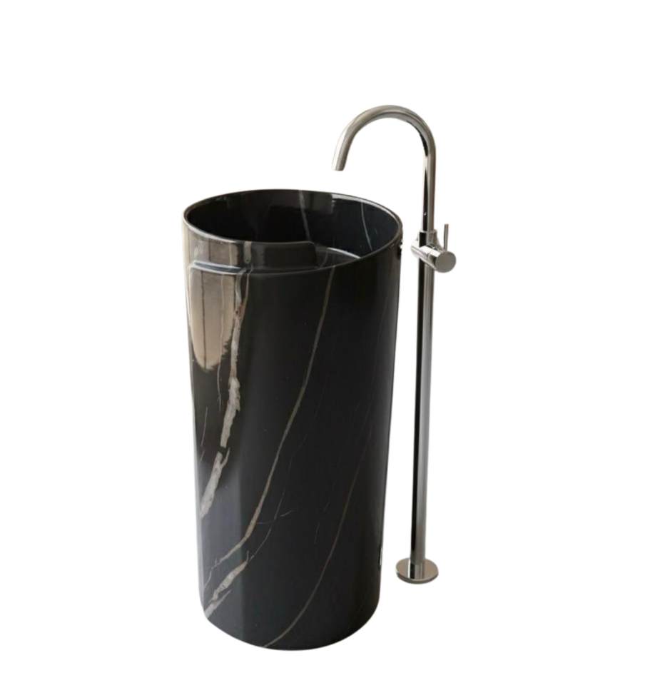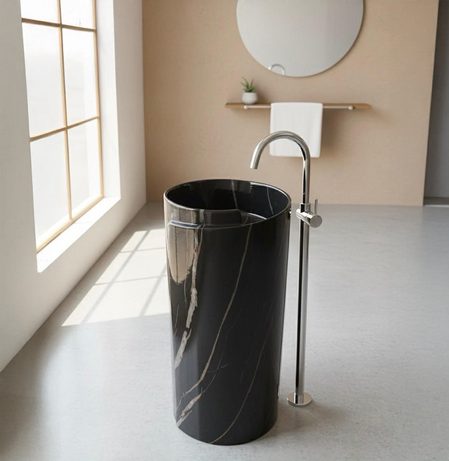 The Cruze Obsidian pedestal basin embodies bold refinement. Crafted from deep black marble with elegant white streaks, it pairs beautifully with chrome fixtures, serving as the perfect centerpiece for contemporary luxury bathrooms.