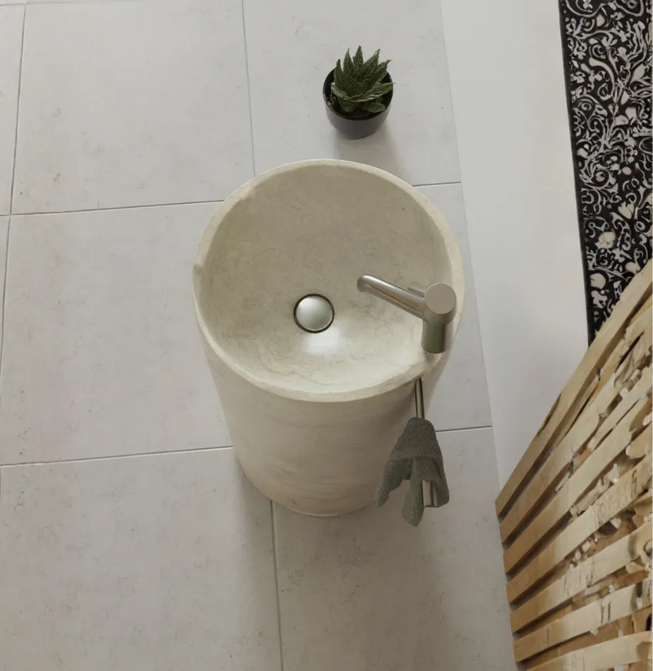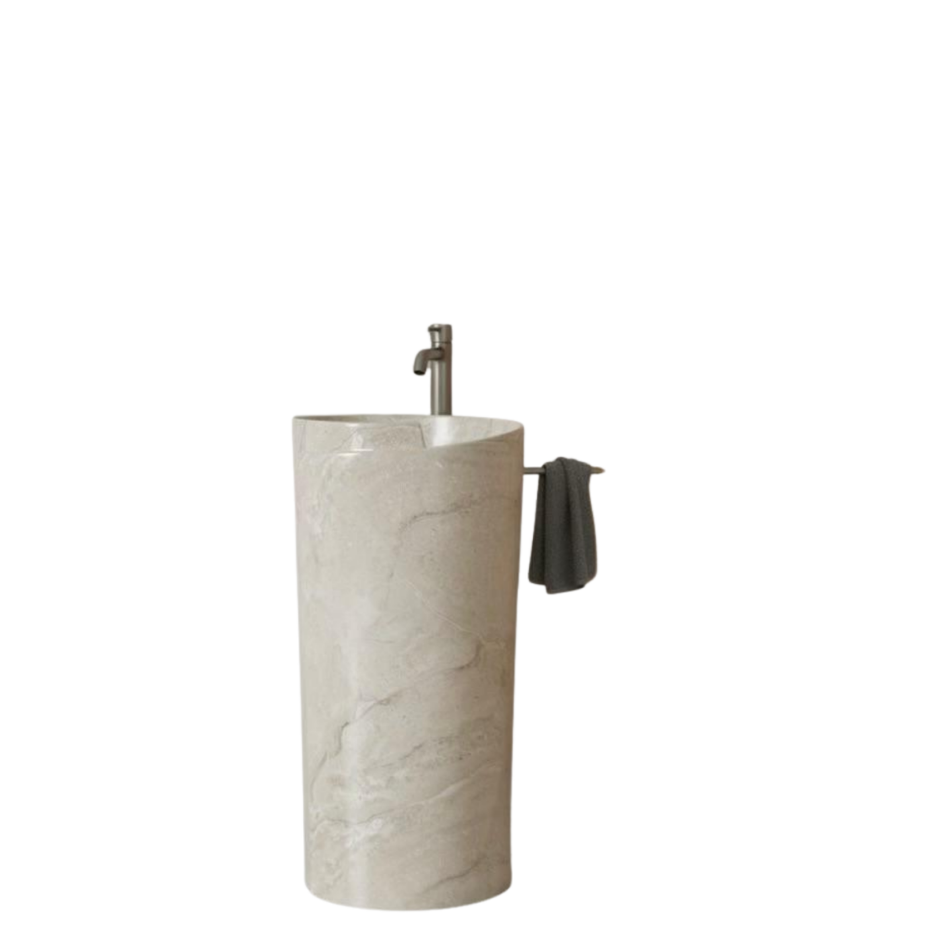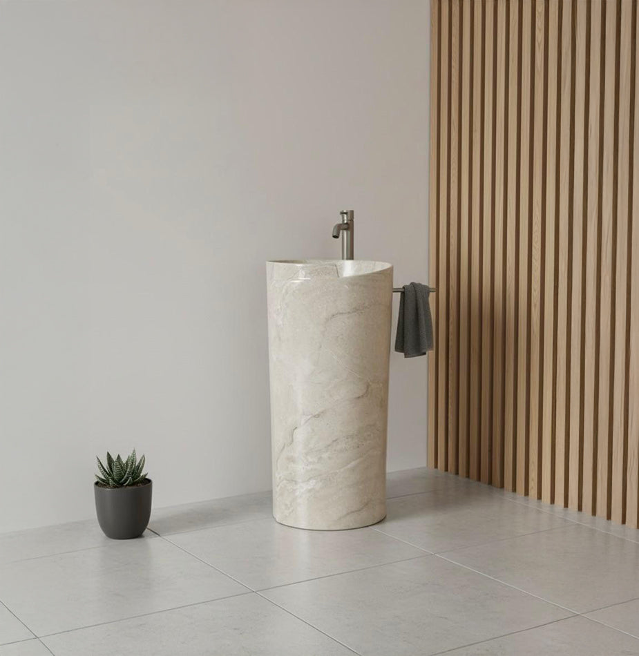 The Cruze Drift features a soft ivory marble pedestal with flowing patterns that blend warmth and elegance. Its soft matt texture complements wood textures and neutral palettes. Crafted from premium-quality ceramic with a crystalline glaze, it ensures durability, resistance to stains and scratches, and effortless maintenance. Designed for pedestal setup, this basin offers a refined look with lasting performance — ideal for both residential and commercial environments.